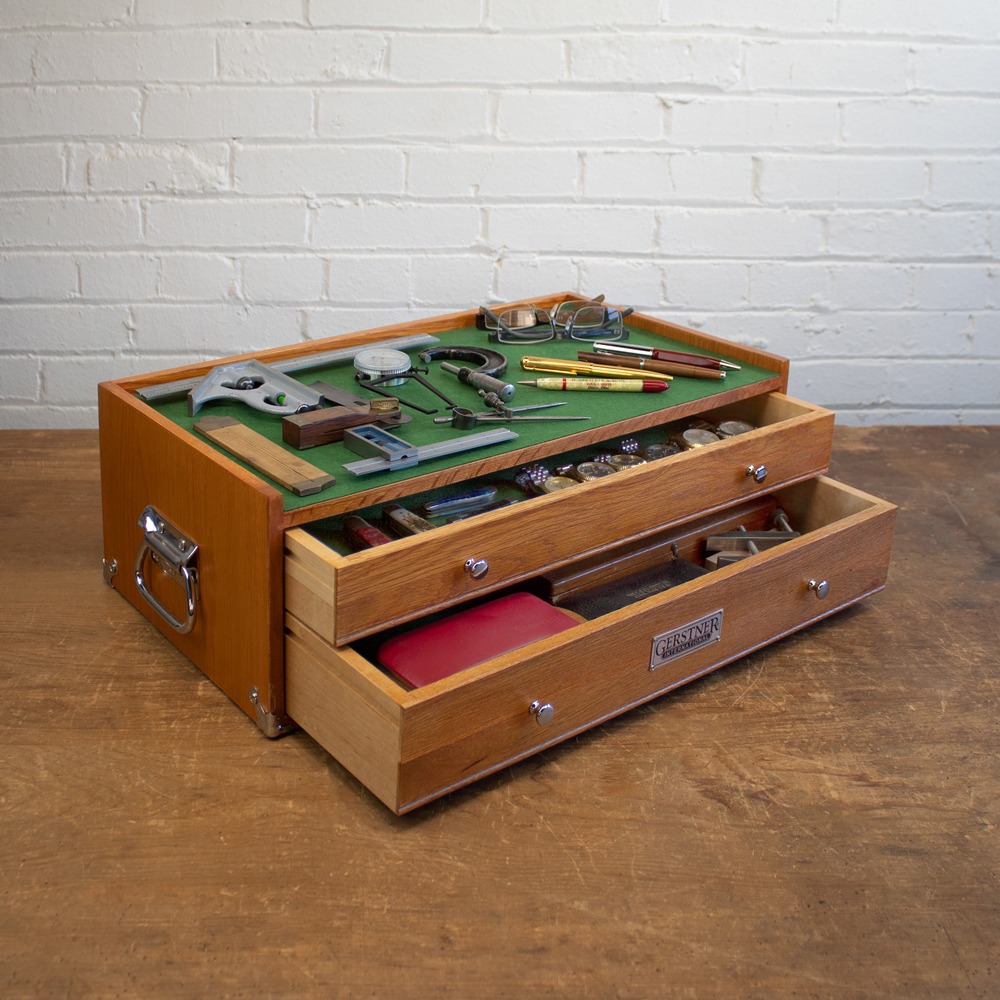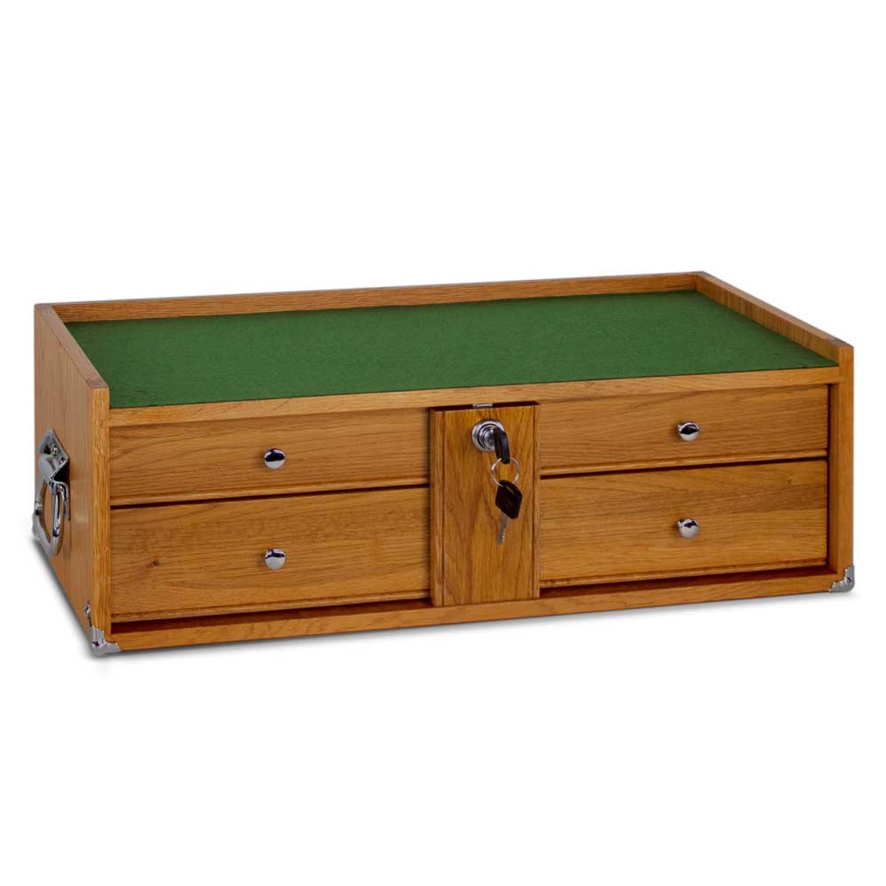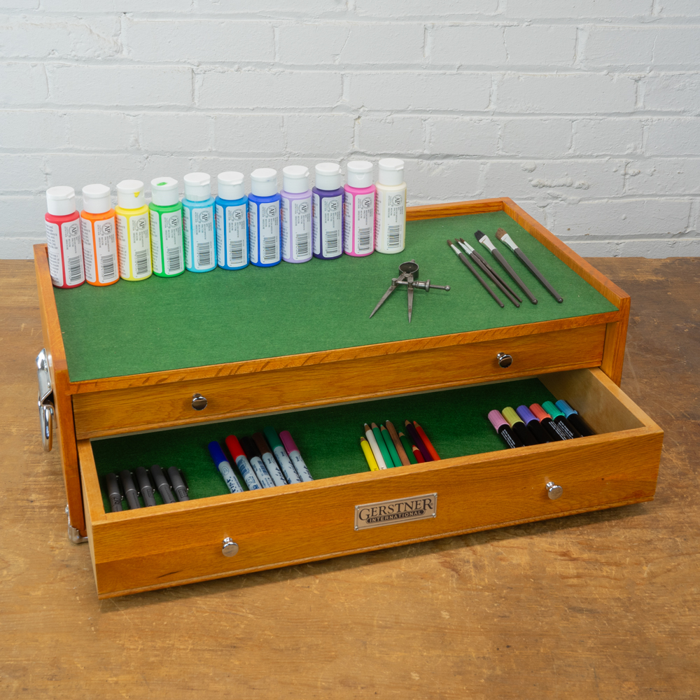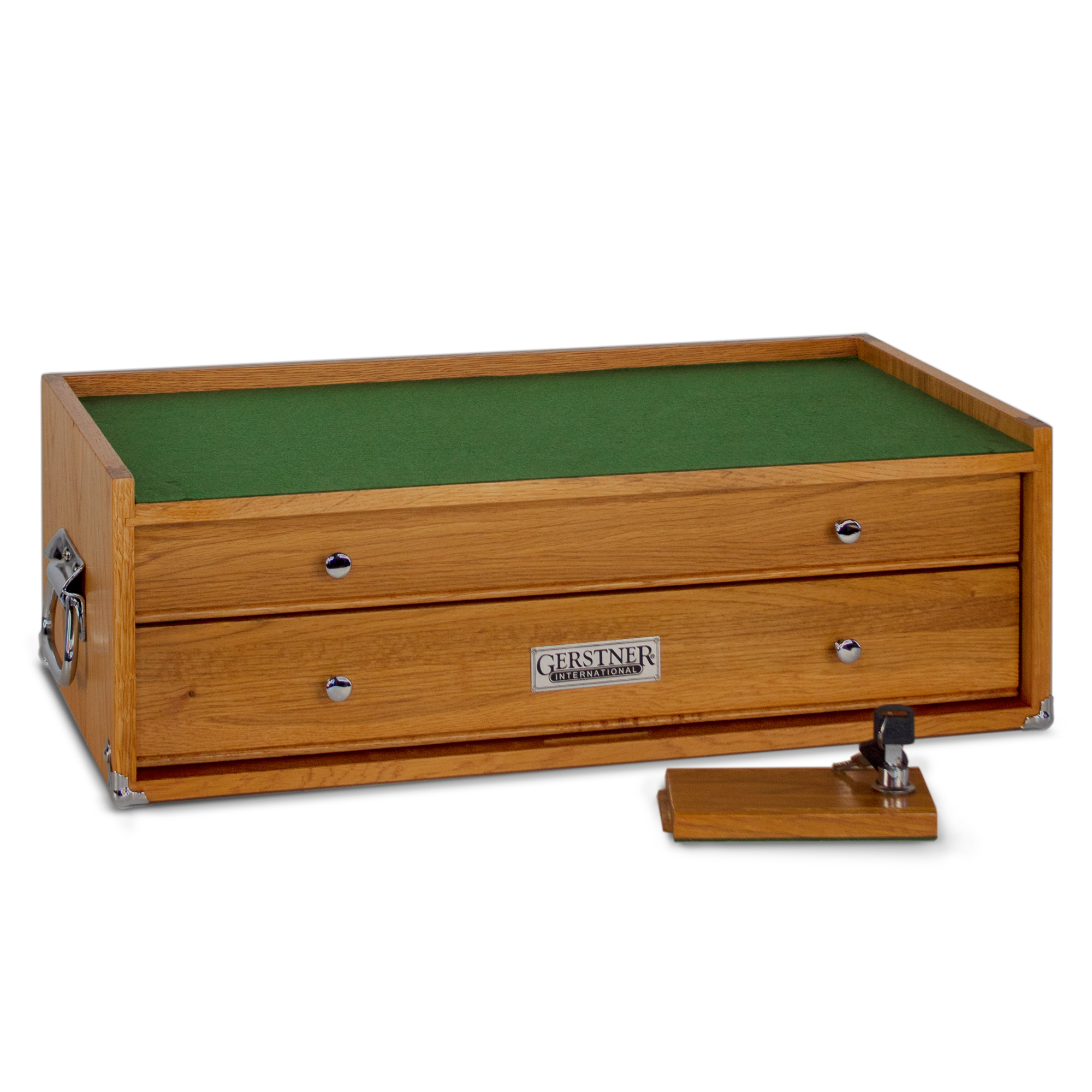 The Gerstner International GI-M20A Hobby Mid-Base Oak 5-Drawer Hobby Chest is an imported, classic American style chest, constructed of red oak hardwood and red oak veneers. It has a flat, felt-lined top that comes in handy wherever space is a premium. Stack whatever was already on the worktop right on this base—maybe a tool chest, a computer monitor, a set of books, a collection on display, a stand mixer, sewing machine, or tabletop machinery…whatever takes up table space. This way, important equipment is tidily displayed without wasting room, and now there’s additional locking storage underneath it—who couldn’t use more of that? This base has two full-width, felt-lined drawers. They're mounted on friction-reducing, molded plastic drawer slides. The M20A features a locking bar instead of a front panel, which increases the usable space in the drawers.