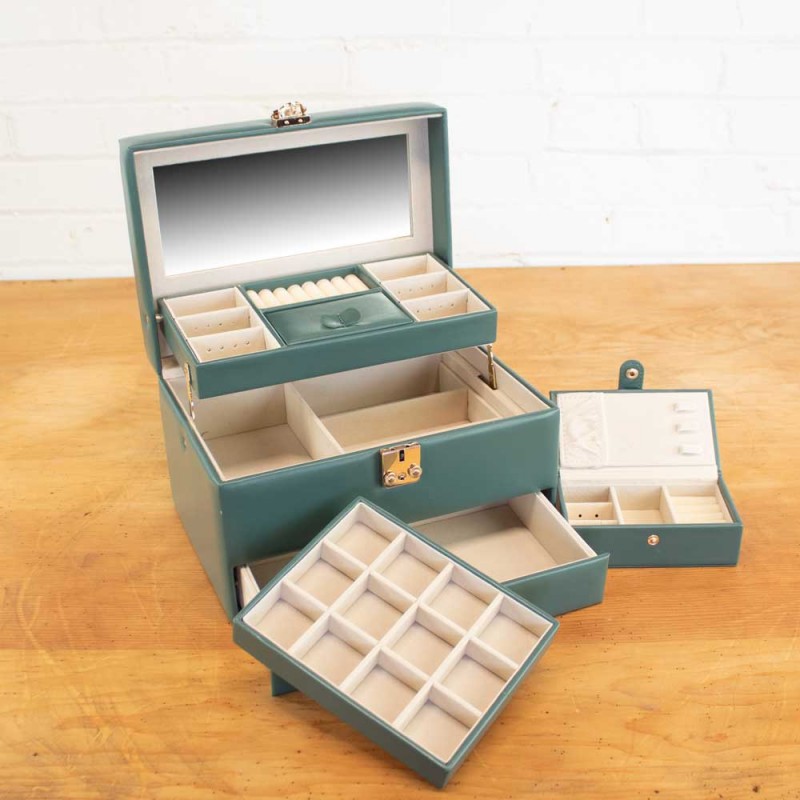 When you open the top of the leather jewelry chest, the drawer slides open and the tray lifts up, giving you easy access to everything inside.  The small portable case inside lets you take a change of jewelry with you, to add some more bling for dinner or a show.