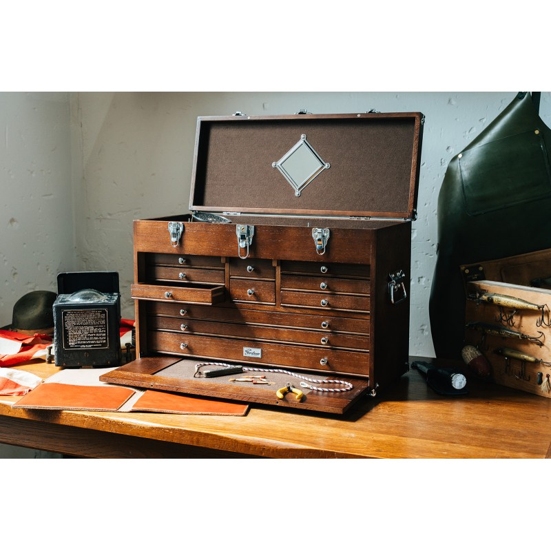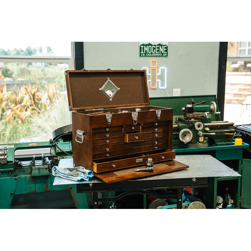 The GI T24 D Tool Chest by Gerstner International includes 11 felt-lined drawers and a lift-up top compartment. The front lid locks in place when closed and slides beneath the drawers during use. A traditional design that’s ideal for tools, collectibles, or precision gear.